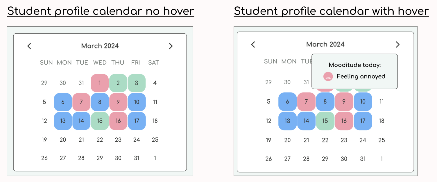 Calendar provides an at a glance way for teachers to notice patterns within the students’ mood check ins.